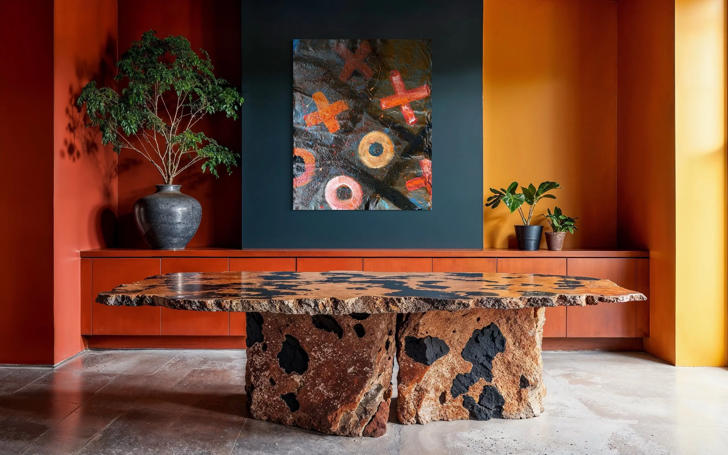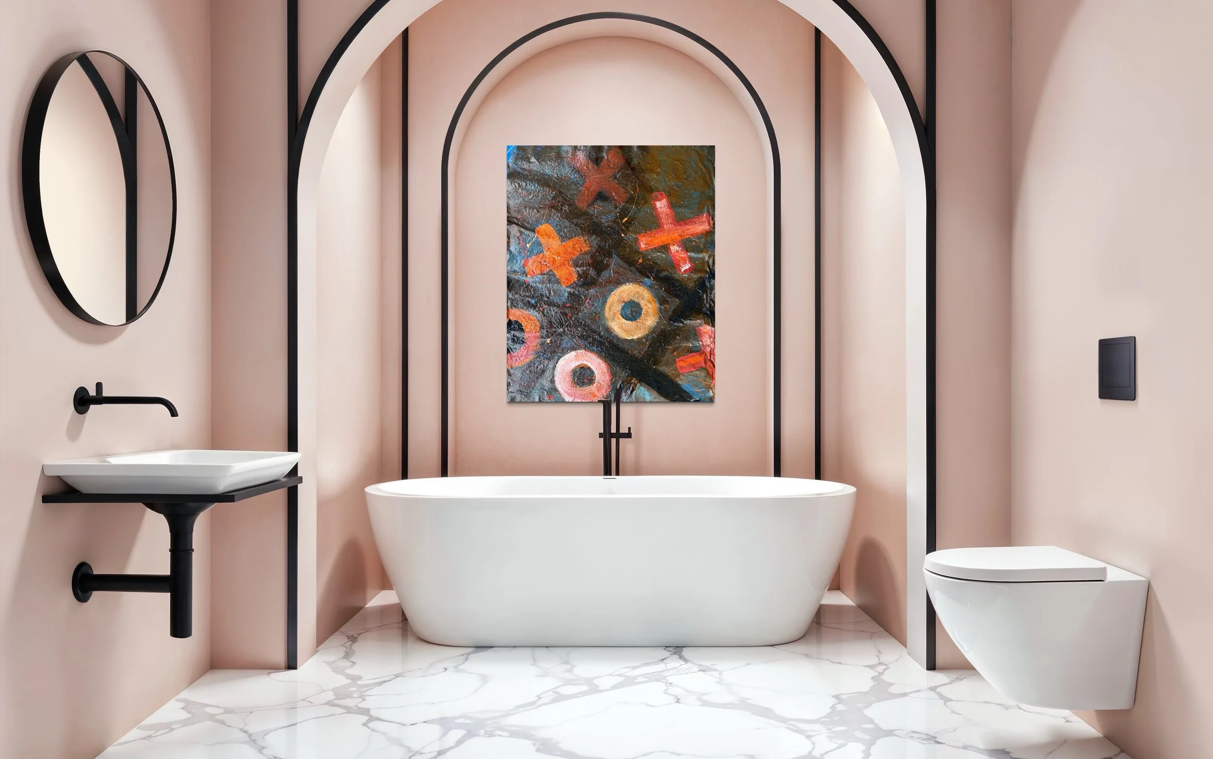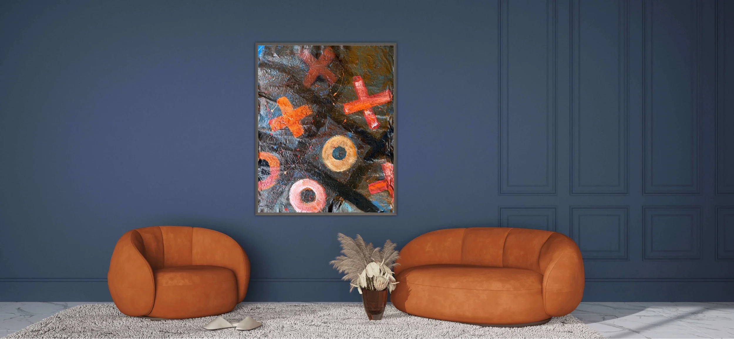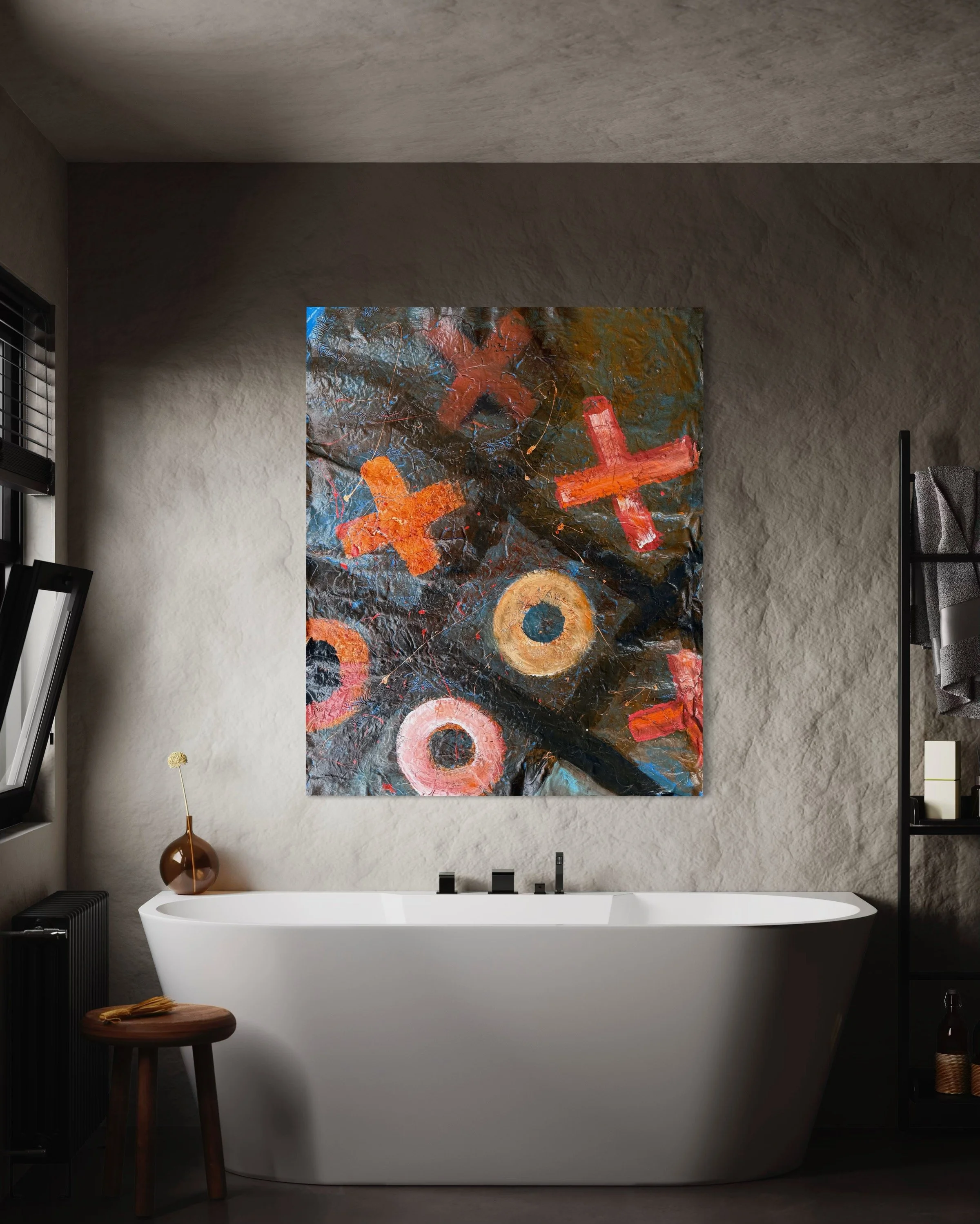 Vibrant crosses and circles dance across a dark canvas, each mark a playful interaction.
