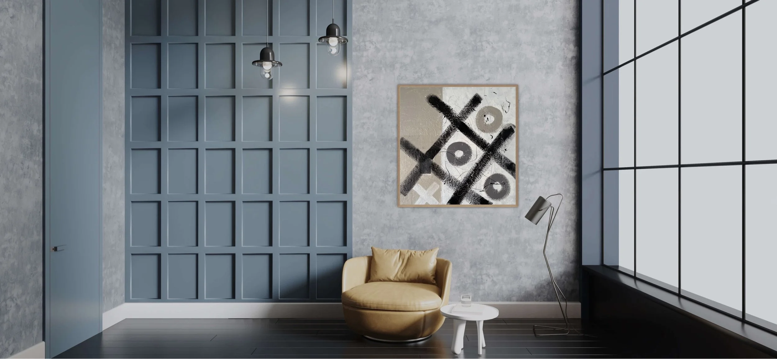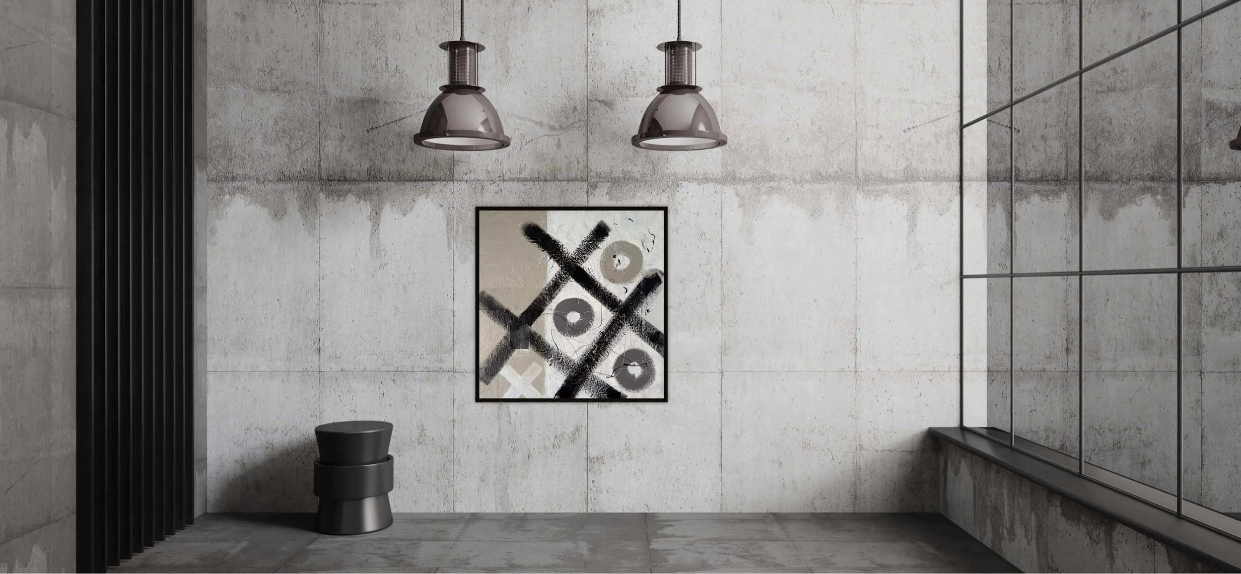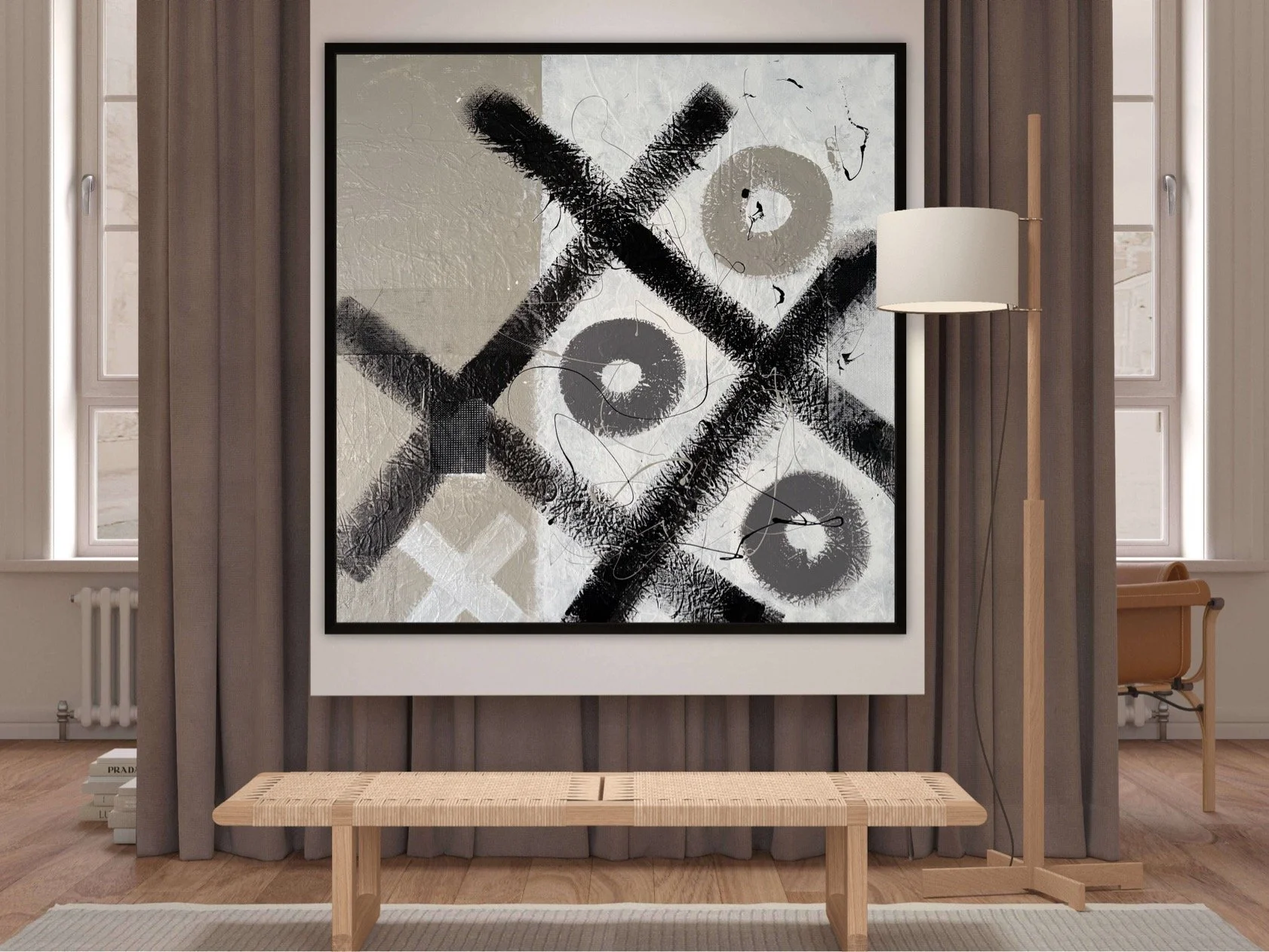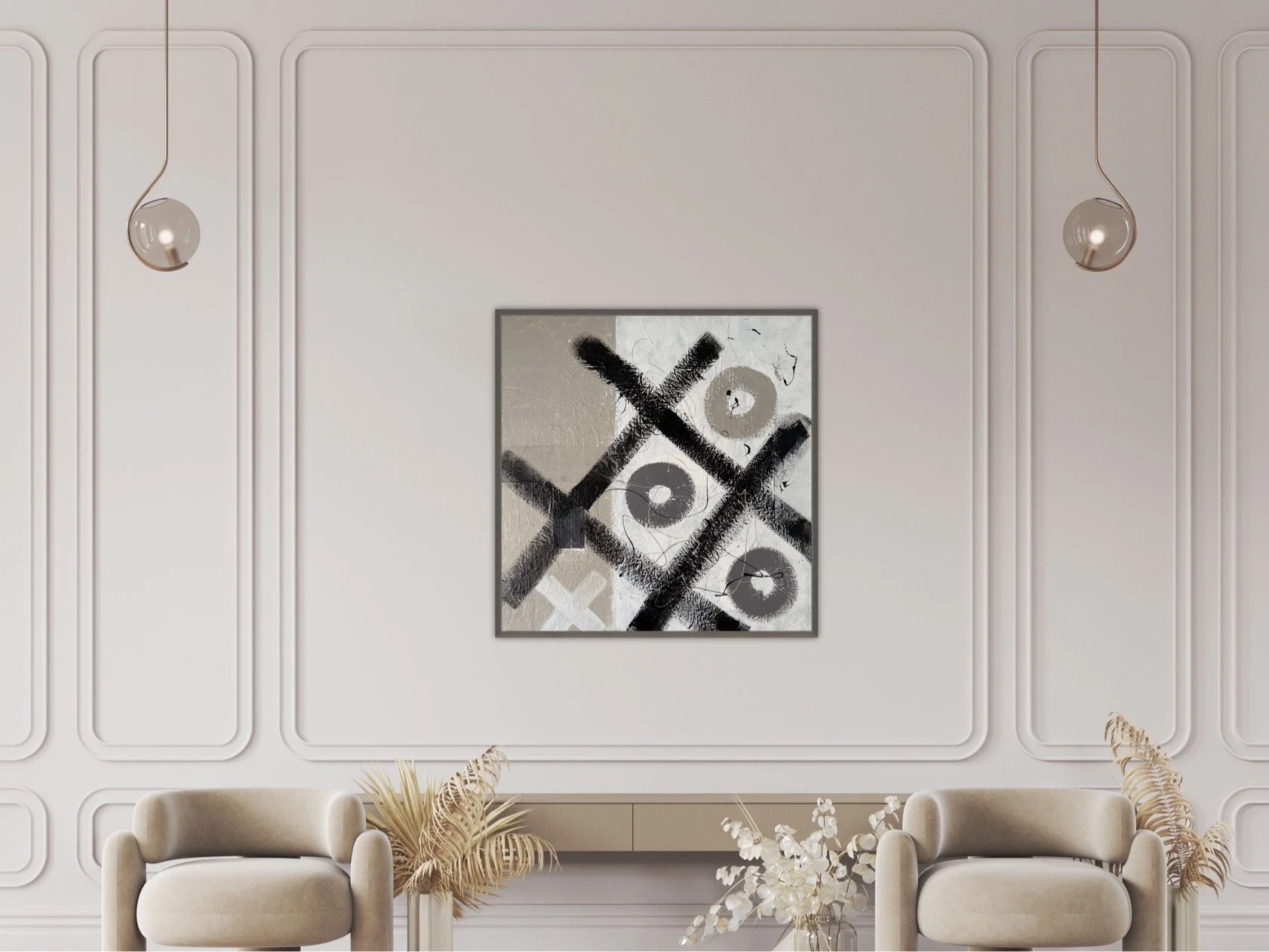 Beyond the obvious tik tag toe (noughts and crosses) is an abstract rendering of Yin Yang. The painting is a neutral palette with bold black accents, enhanced by drips and splats.