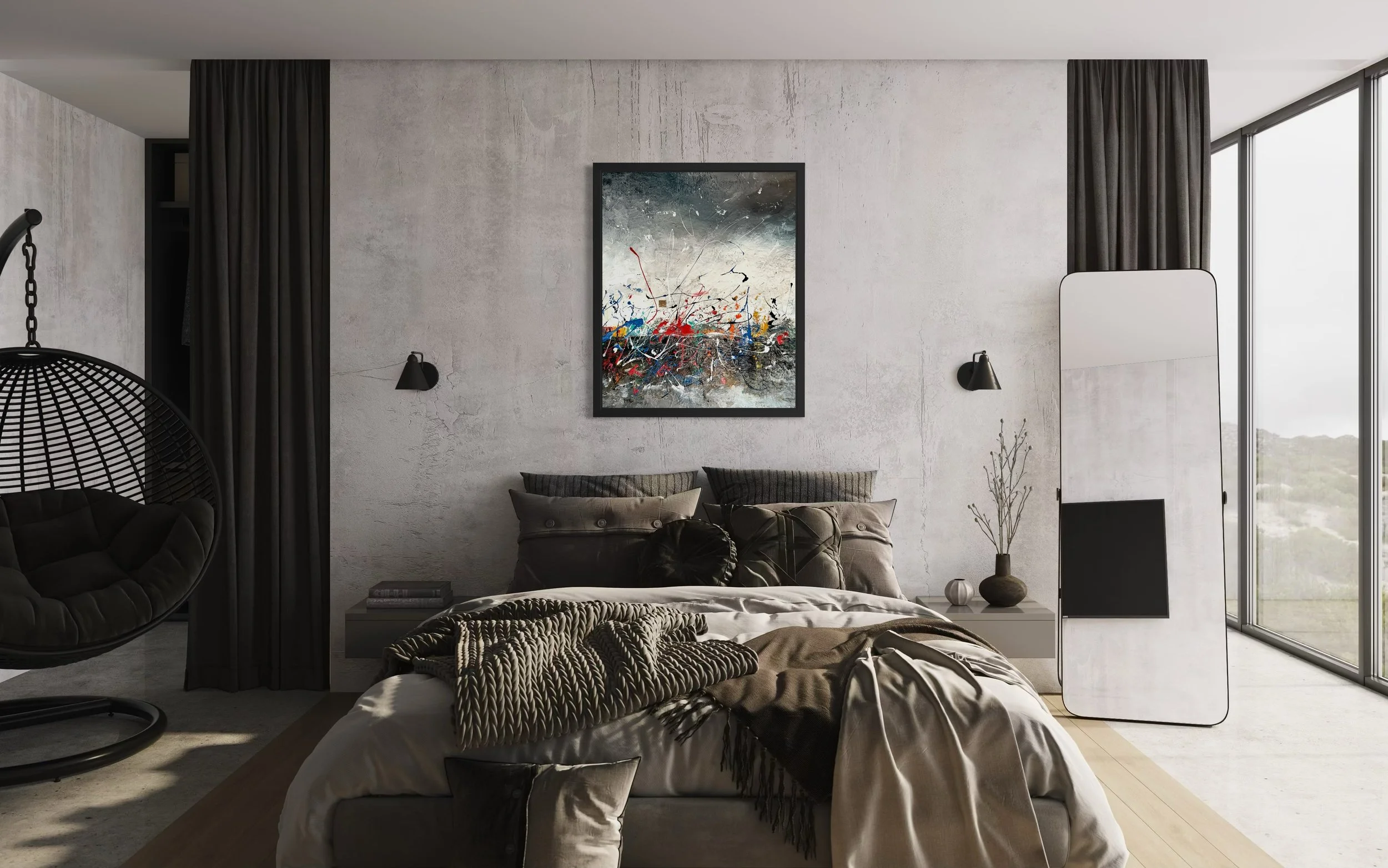 RHYTHMS OF THE STORM A dynamic dance of colors and lines creates a captivating chaotic landscape.48”x36” MIXED MEDIA ON BOARD$3,703 INTERESTED IN ORIGINAL FINE ART & MERCH