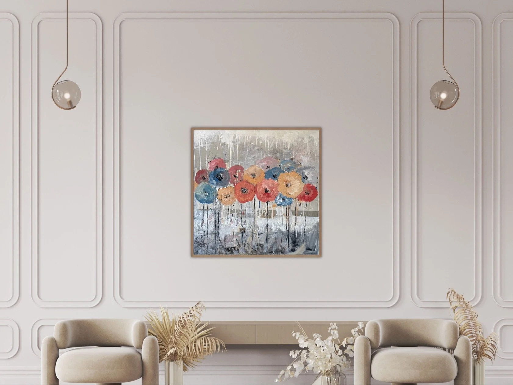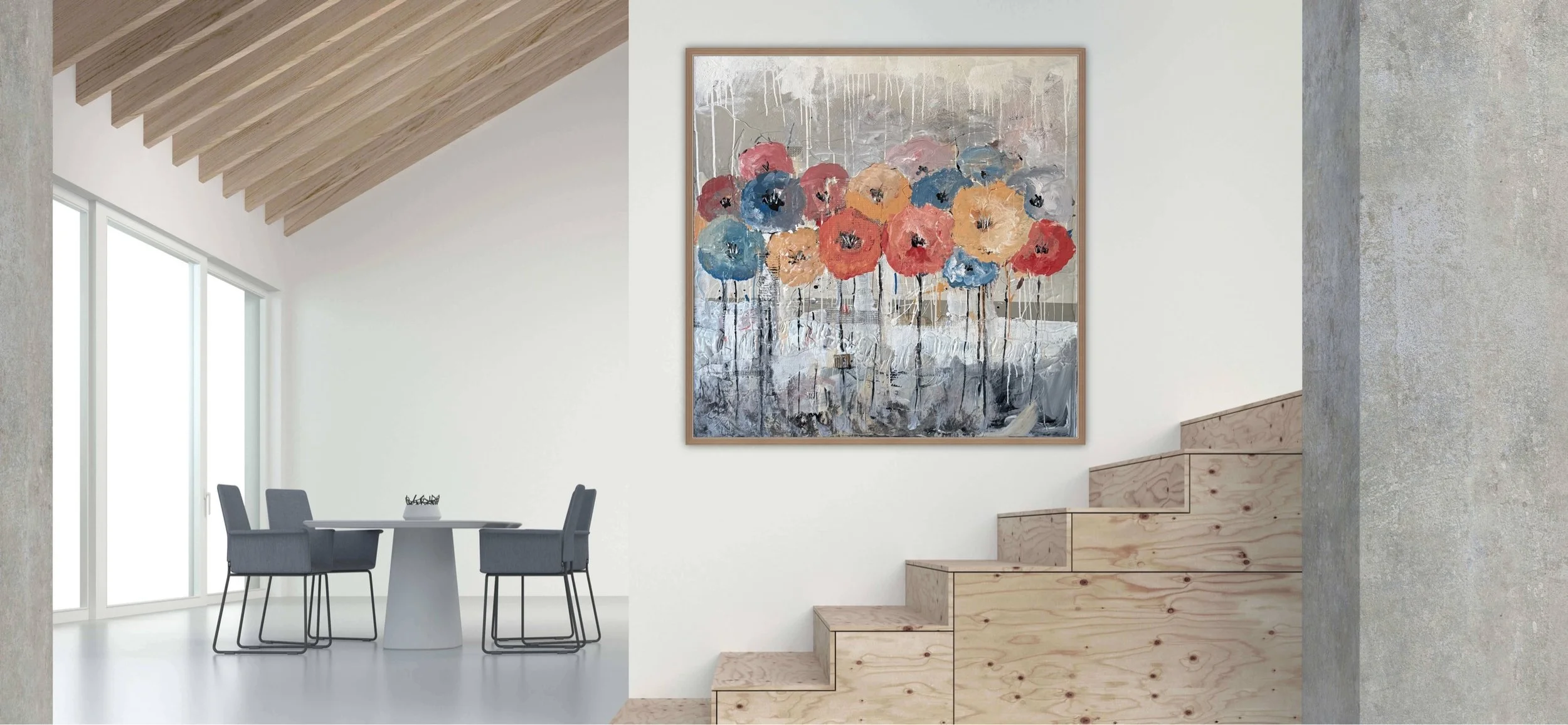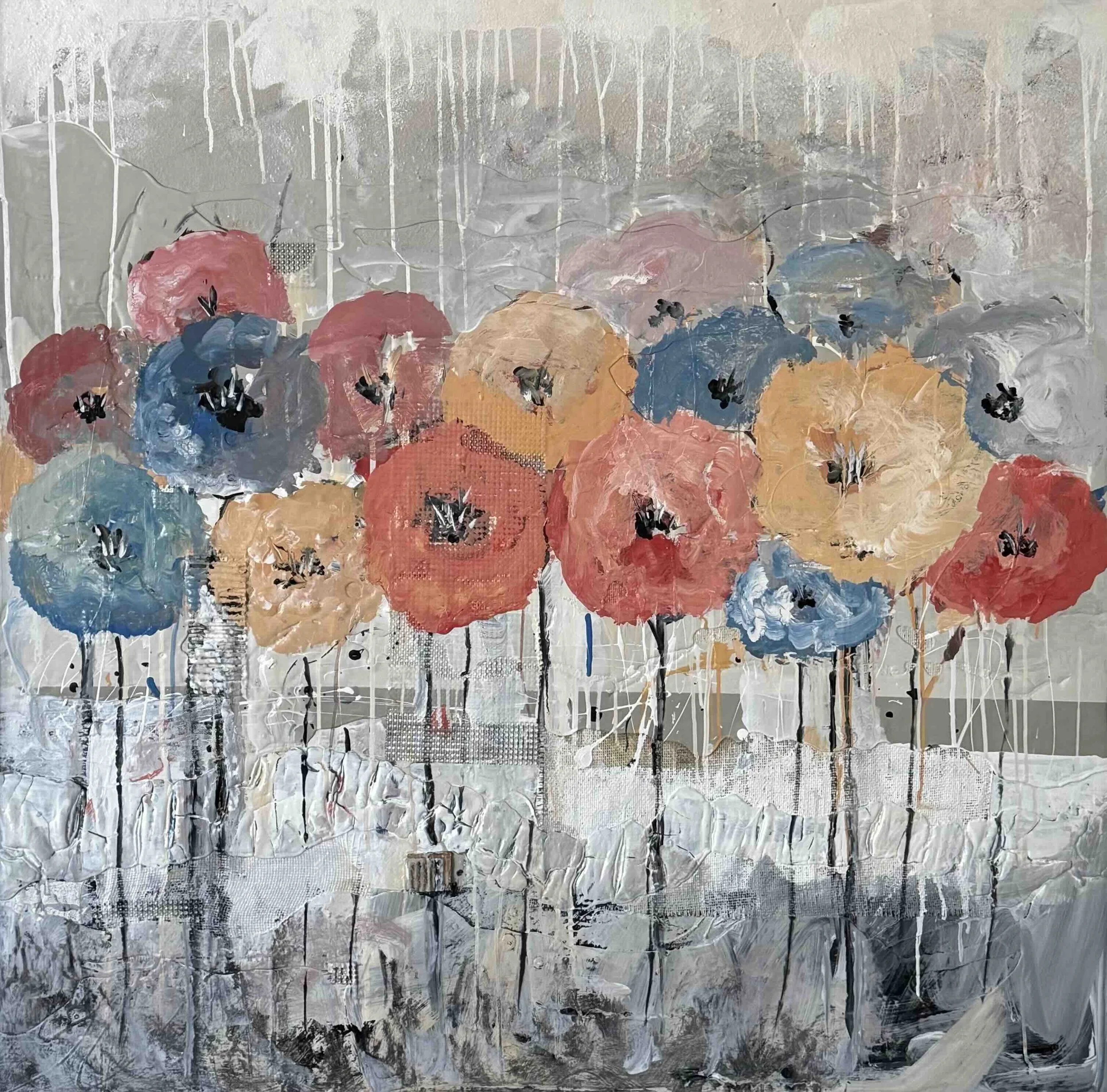 This vibrant floral piece incorporates multiple techniques, including abstract impressionism and collage. The painting if painted loosely and freely giving it movement and passion. Yet there is a romantic softness to it.