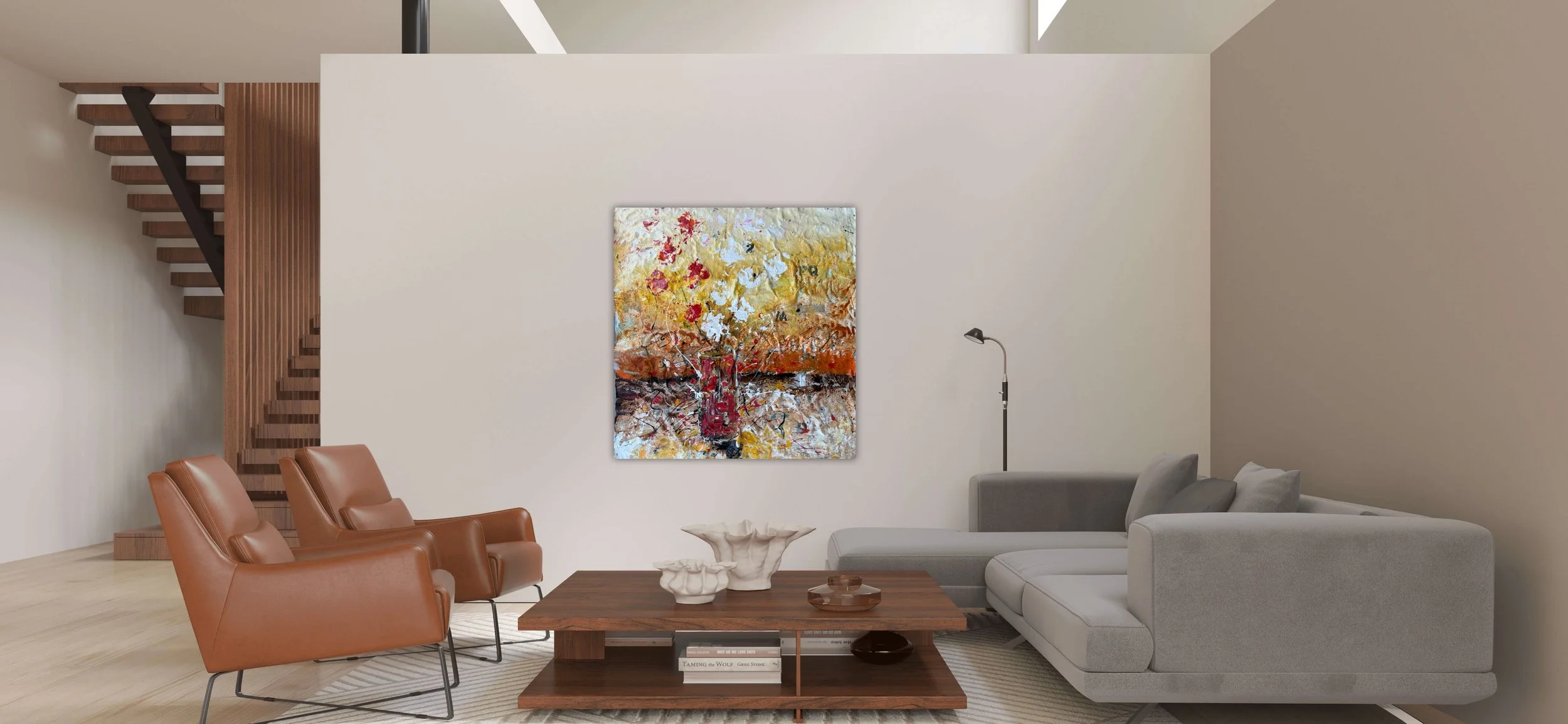 Bold, dynamic and dramatic autumn colors and soft petals create a romantic tension of energy in this abstract expressionist floral.