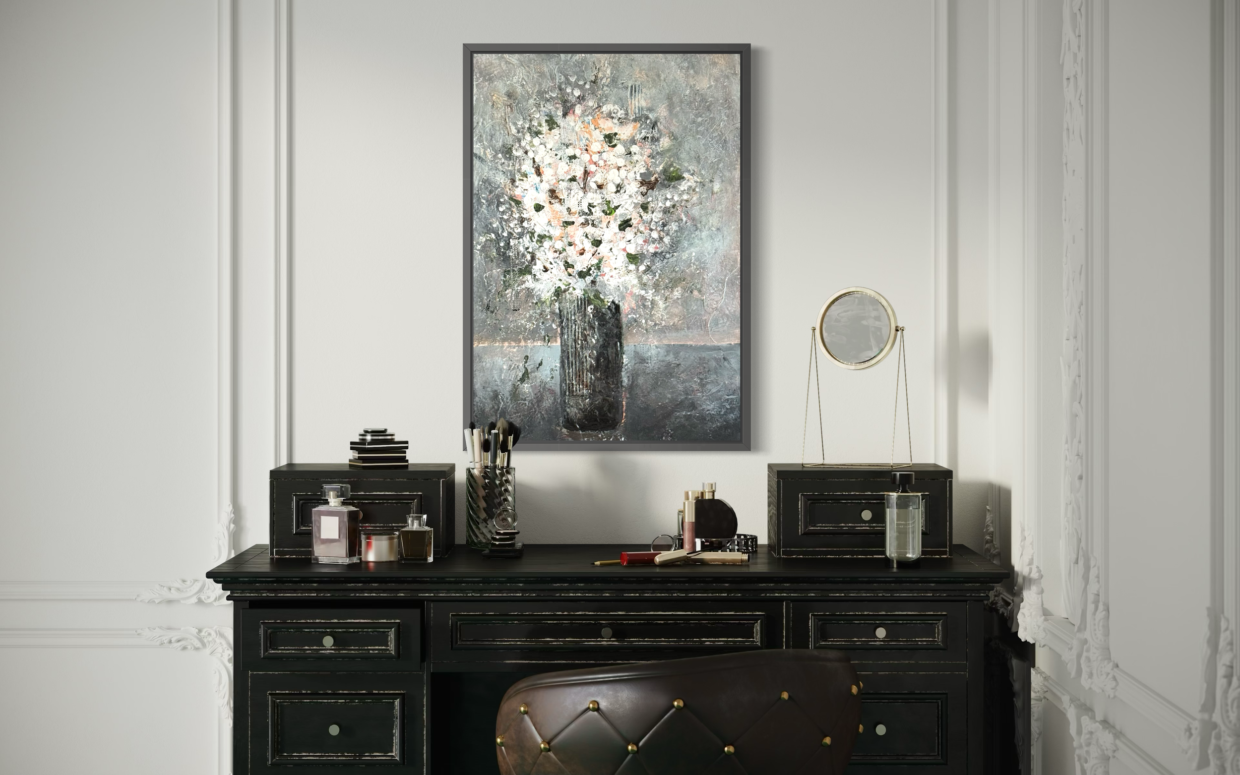 A dramatic and intense floral arrangement captures the soft beauty of blooms in muted tones, evoking a sense of remorse.