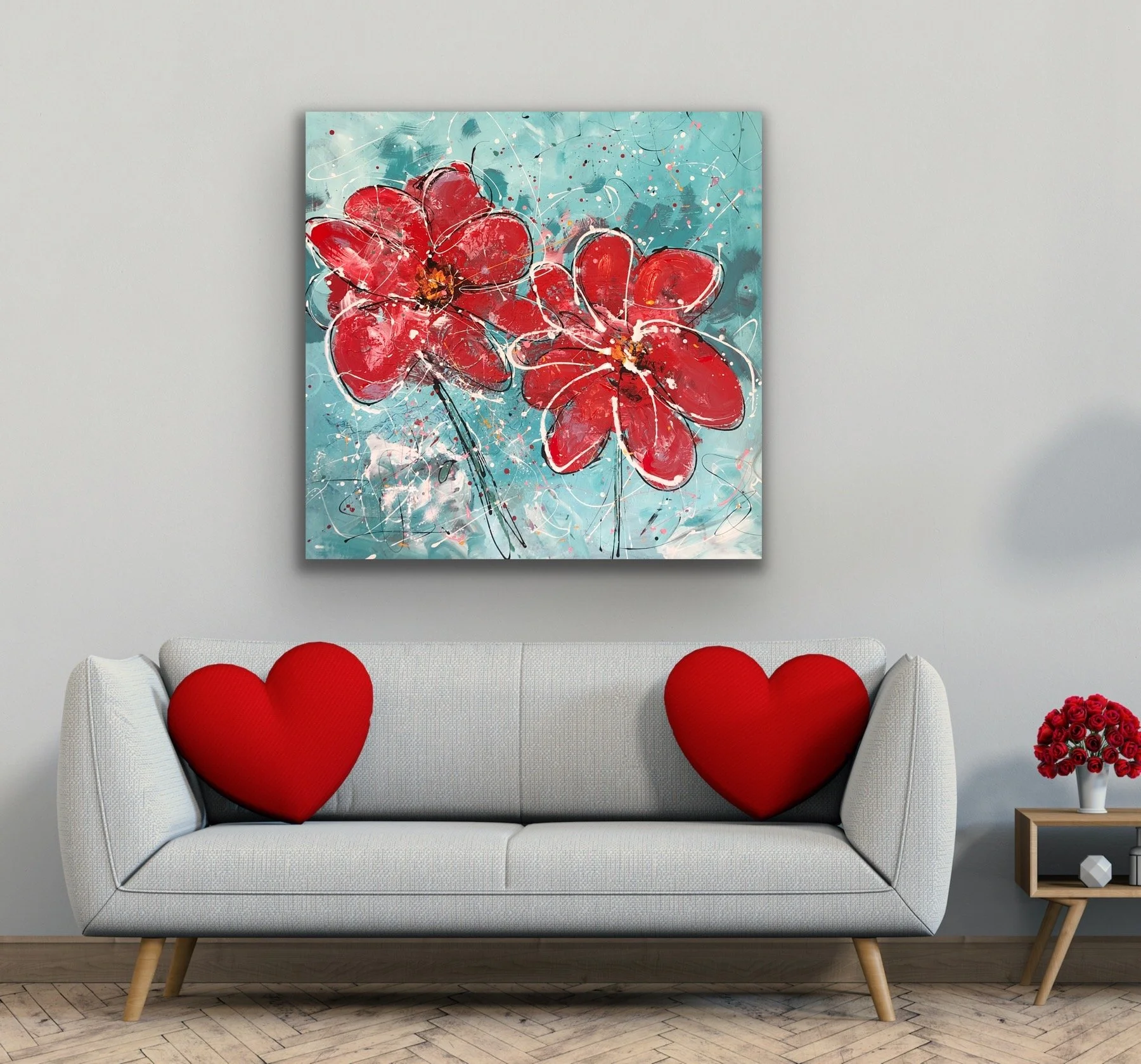 Dramatic red abstract impressionist flowers against an industrial design inspired white, brown and grey backdrop tells a story of how vulnerability is powerful.