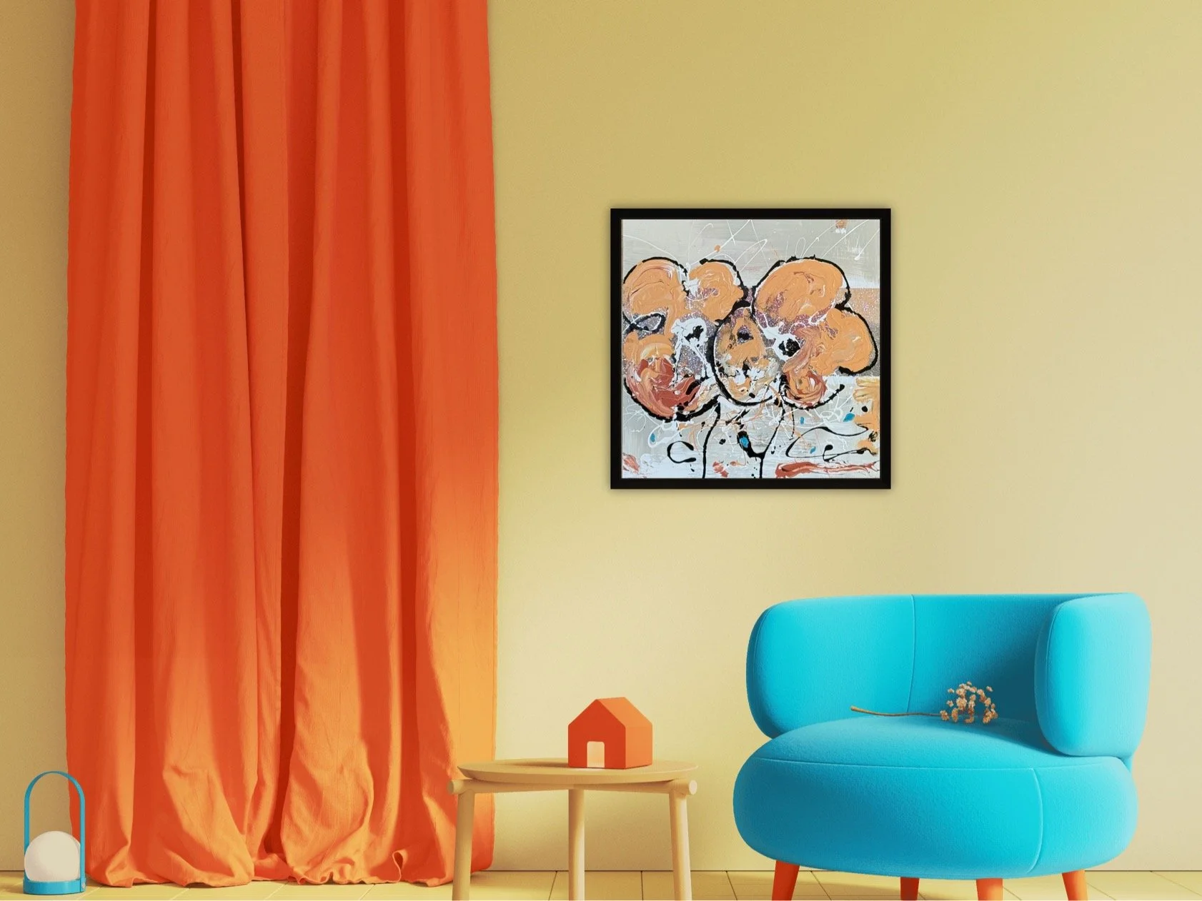 This happy, abstract flower is painted with a spontaneous child-like innocence. Bold yellow, contrasted against a neutral back drop and accentuated with splats, gives it movement and vibrancy.