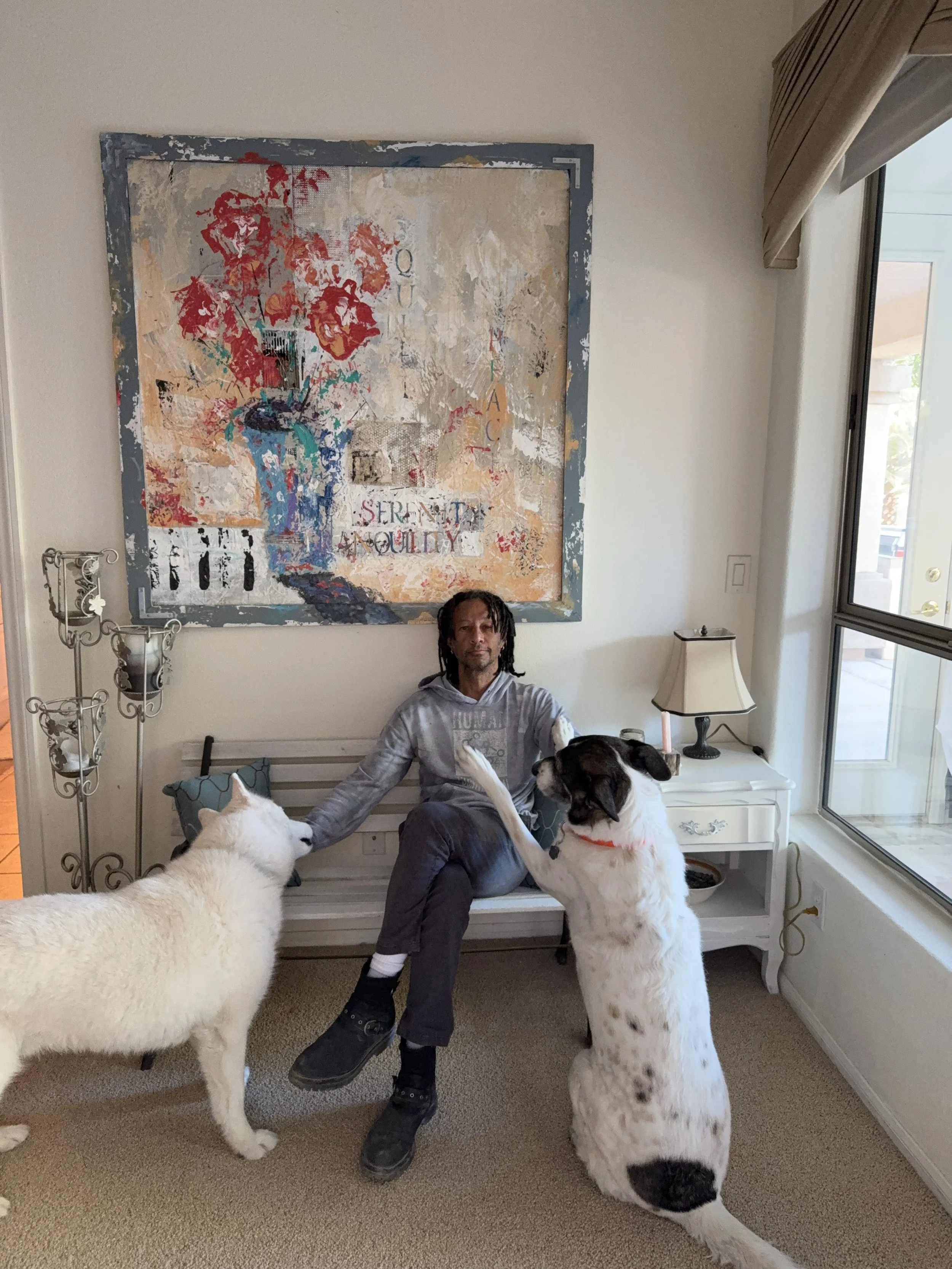 This dynamic floral is filled with energy, texture and meaning. The composition includes words, fabric and other materials that draws the viewer in.