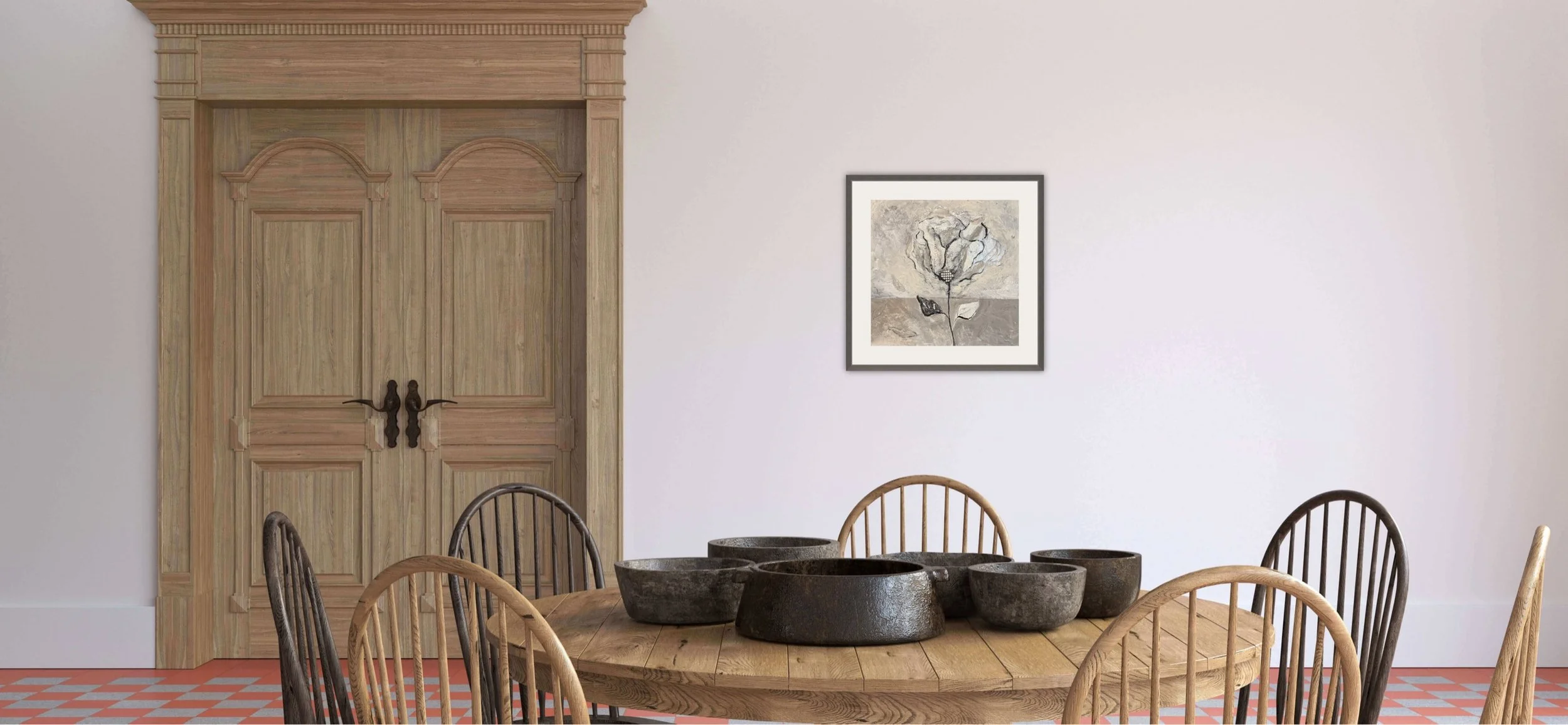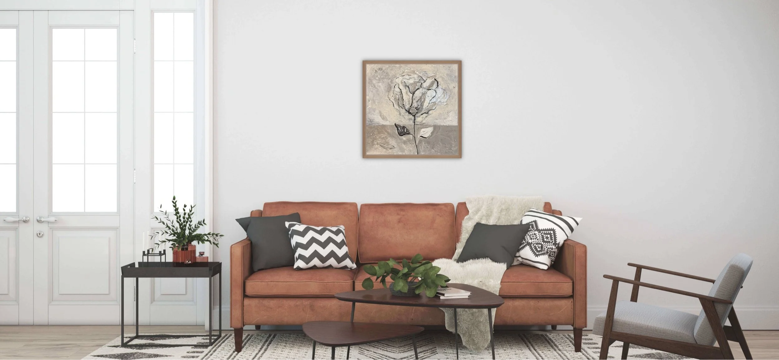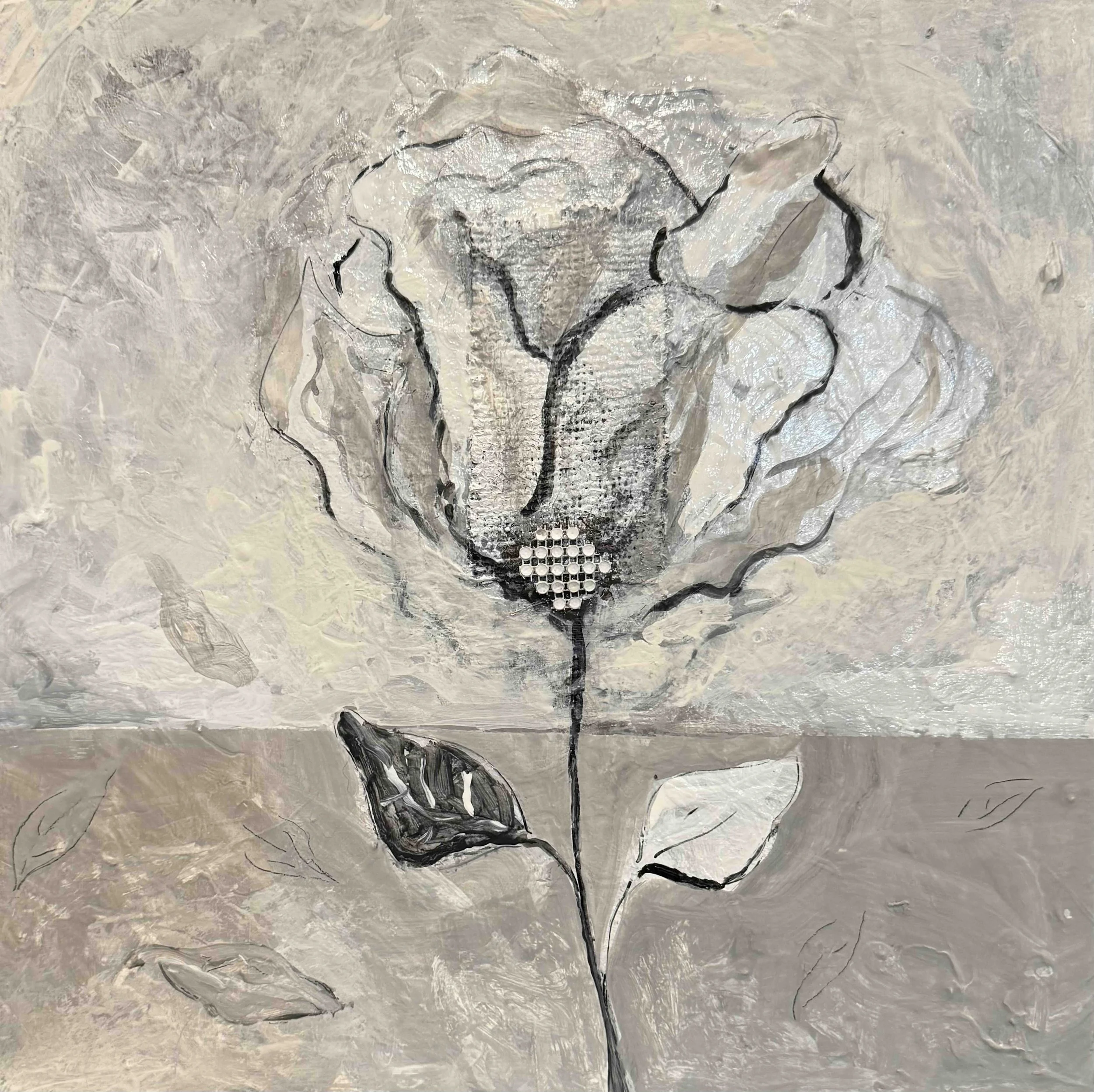 A white flower with thick texture sits in the foreground of a monochromatic light taupe background. The composition is simple with complex layers.