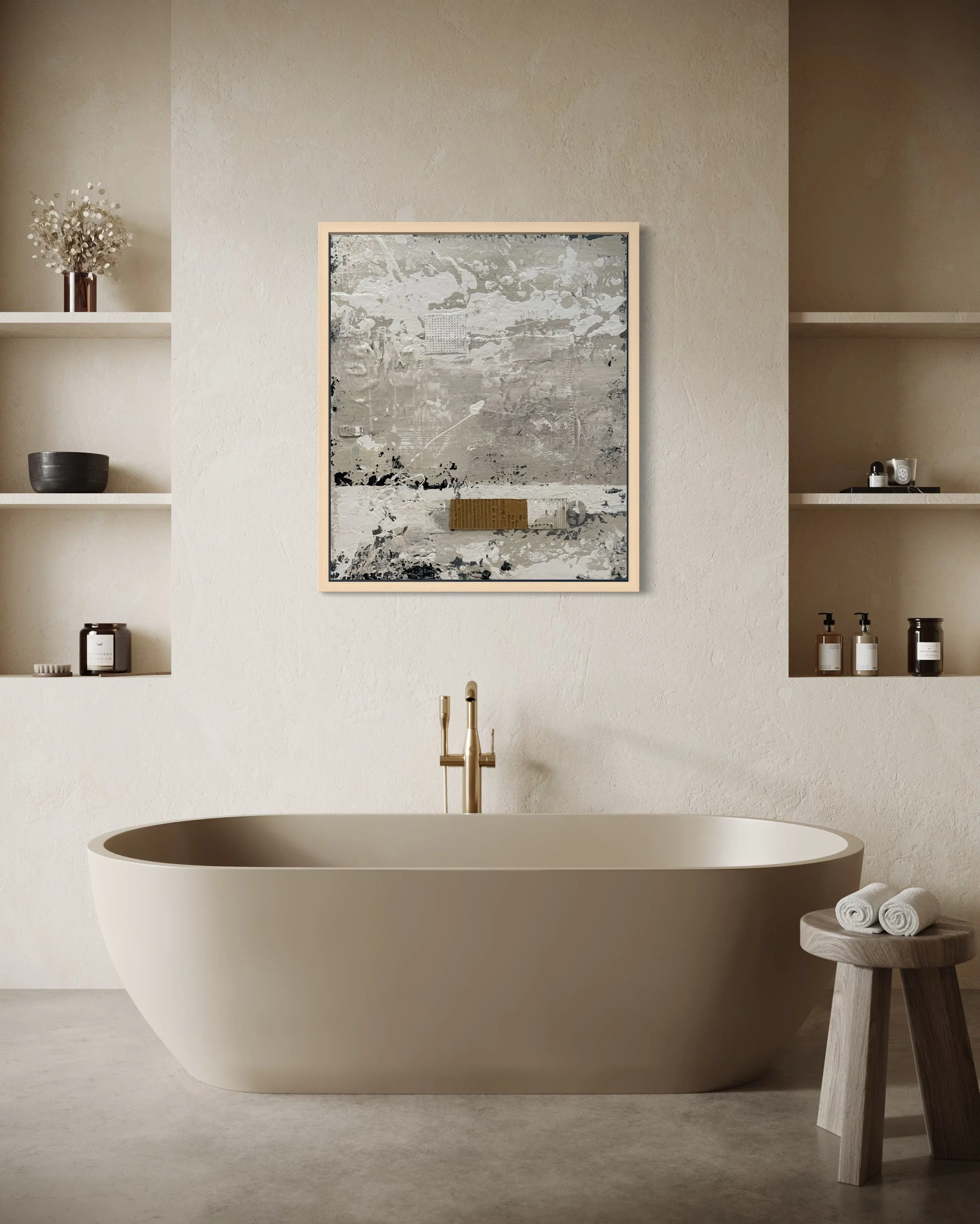 A thickly textured and distressed painting with neutral colors. The collage technique gives it layers and depth.