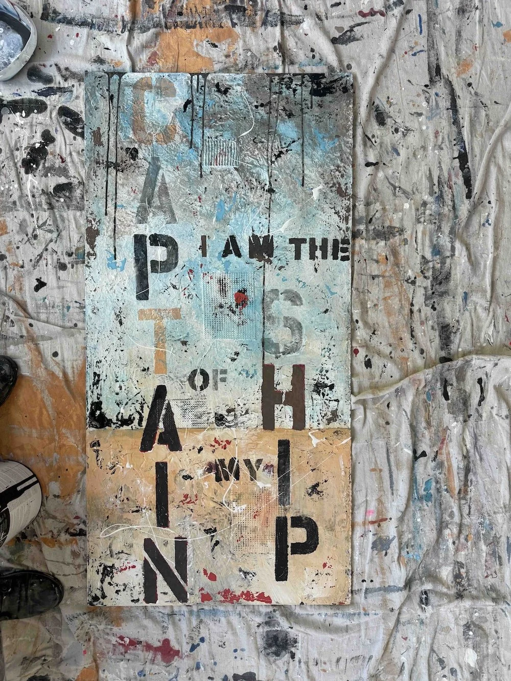 A thickly textured and distressed painting using words to portray a blatant message. The palette is muted, yet dynamic.