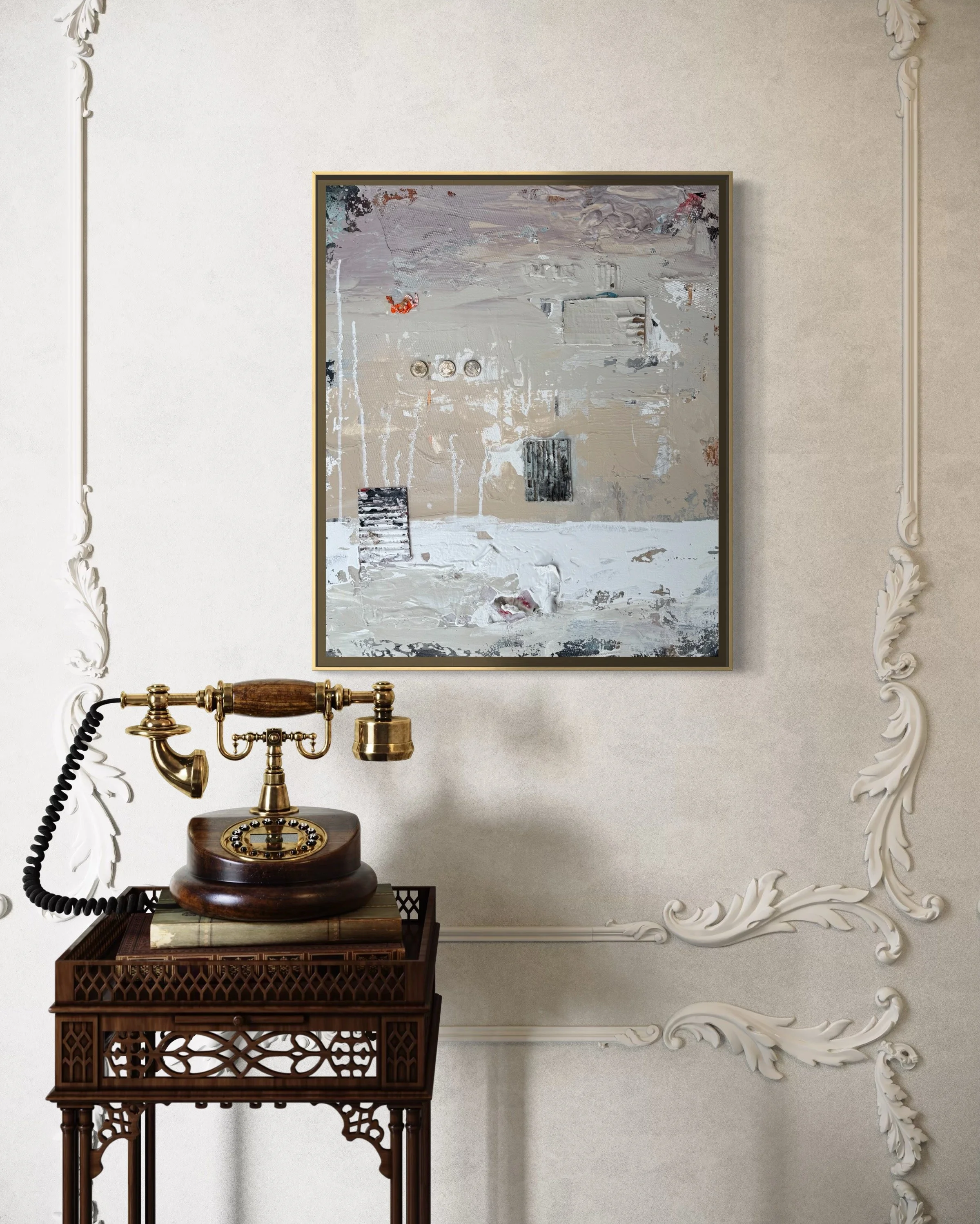 Soft tones and layered textures create a serene, yet intense abstract. The painting is inspired by the nostalgia of living in London (and Europe) with its aged architecture and tradition.