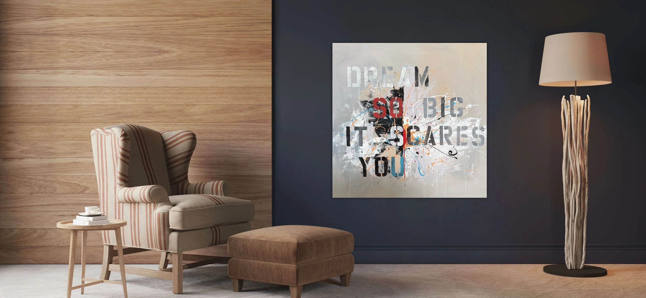 The background is Vital’s signature abstracts expressionist textured style with the foreground accentuated with inspirational words. The palette is predominately greyscale with flashes of color giving it movement and energy.