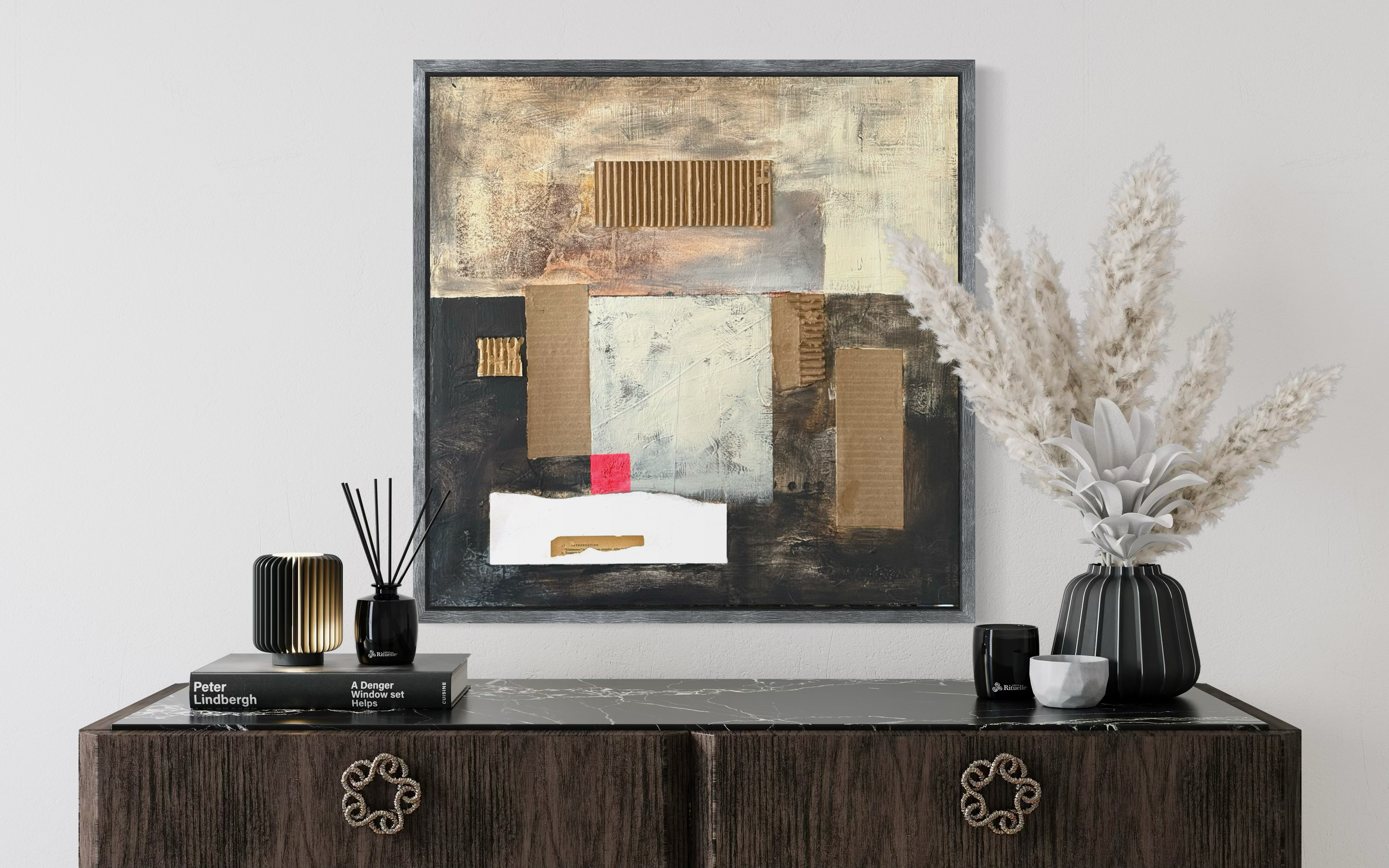 A textured composition blending cardboard with soft hues, creating a sense of layered balance.
