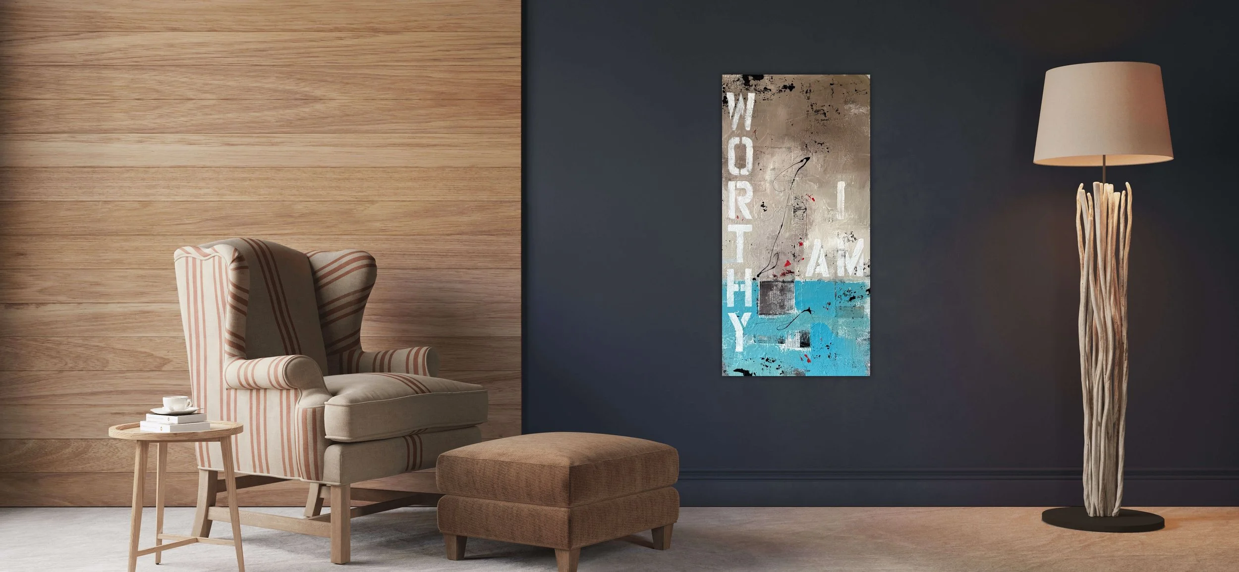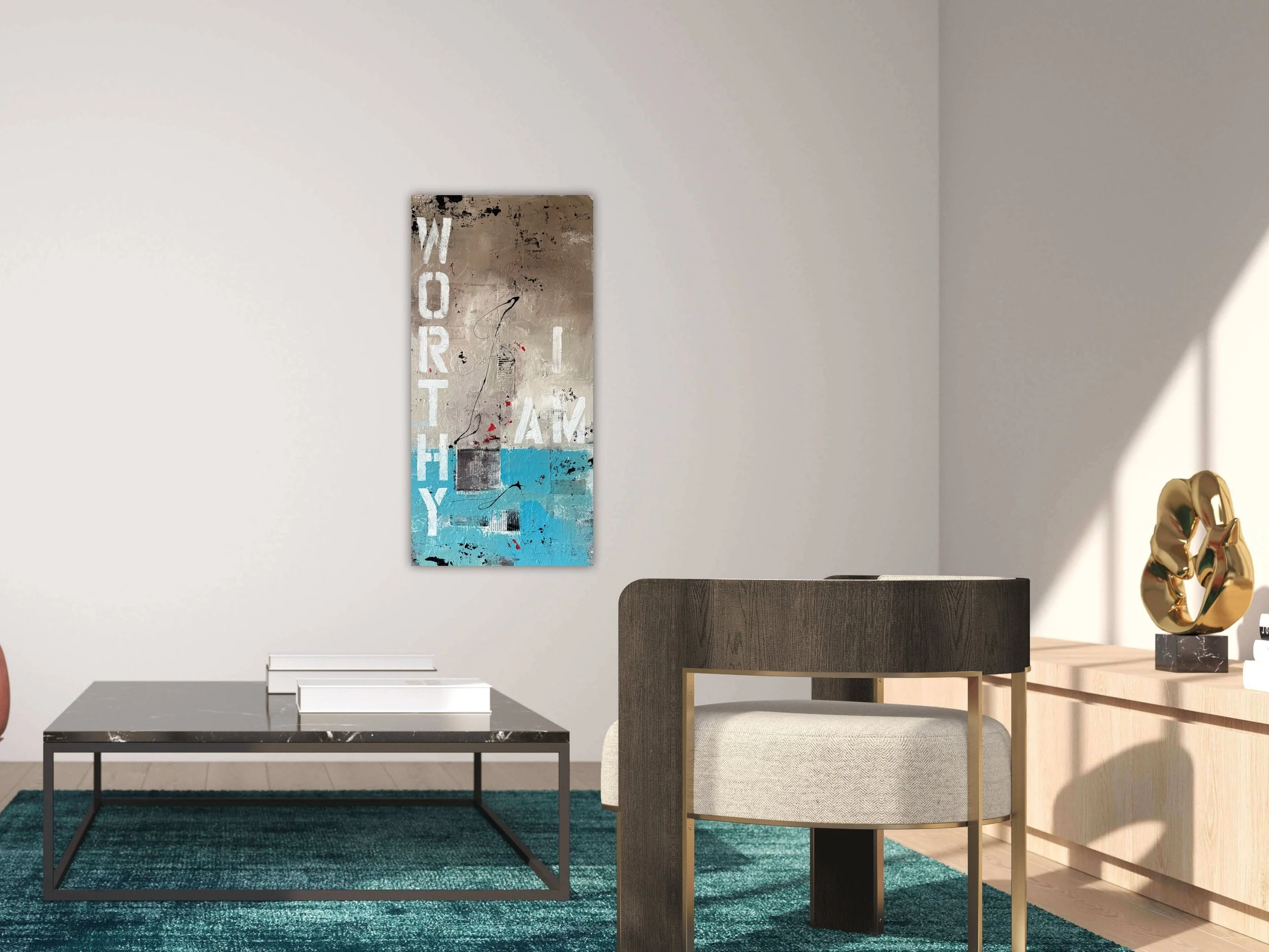 This painting is multifaceted in terms of design and creation, using mixed media and thick layers of texture to create an experiential piece that stimulates the eyes and the sense of touch.