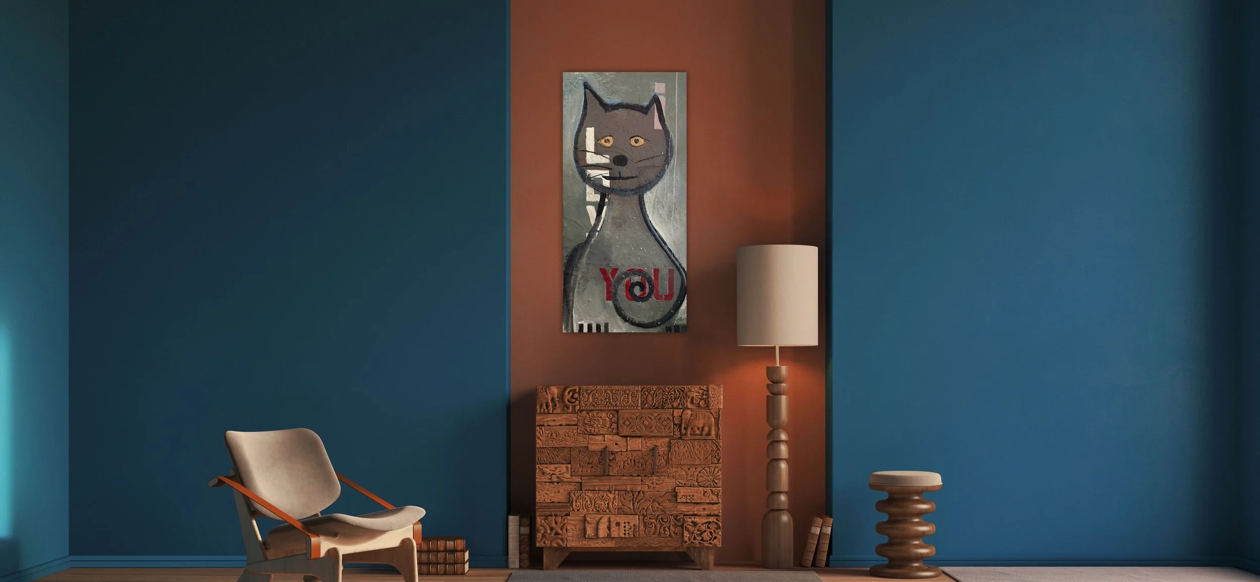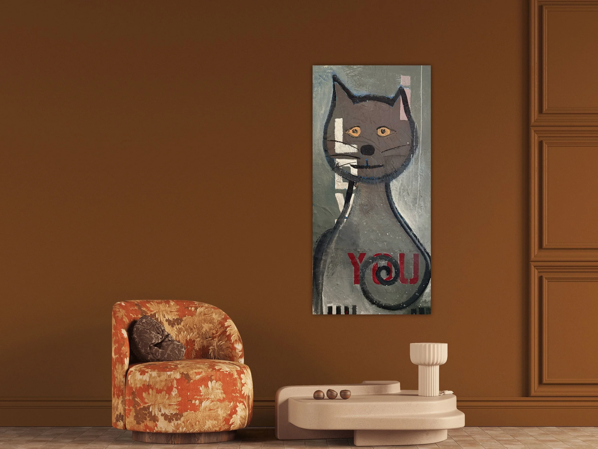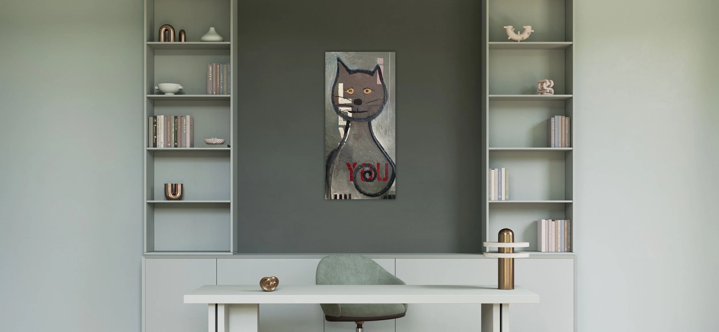 A cat sits poised sharing a profound message of love and affection. The palettes is a muted moss and greying brown with bold letters adding contrast.