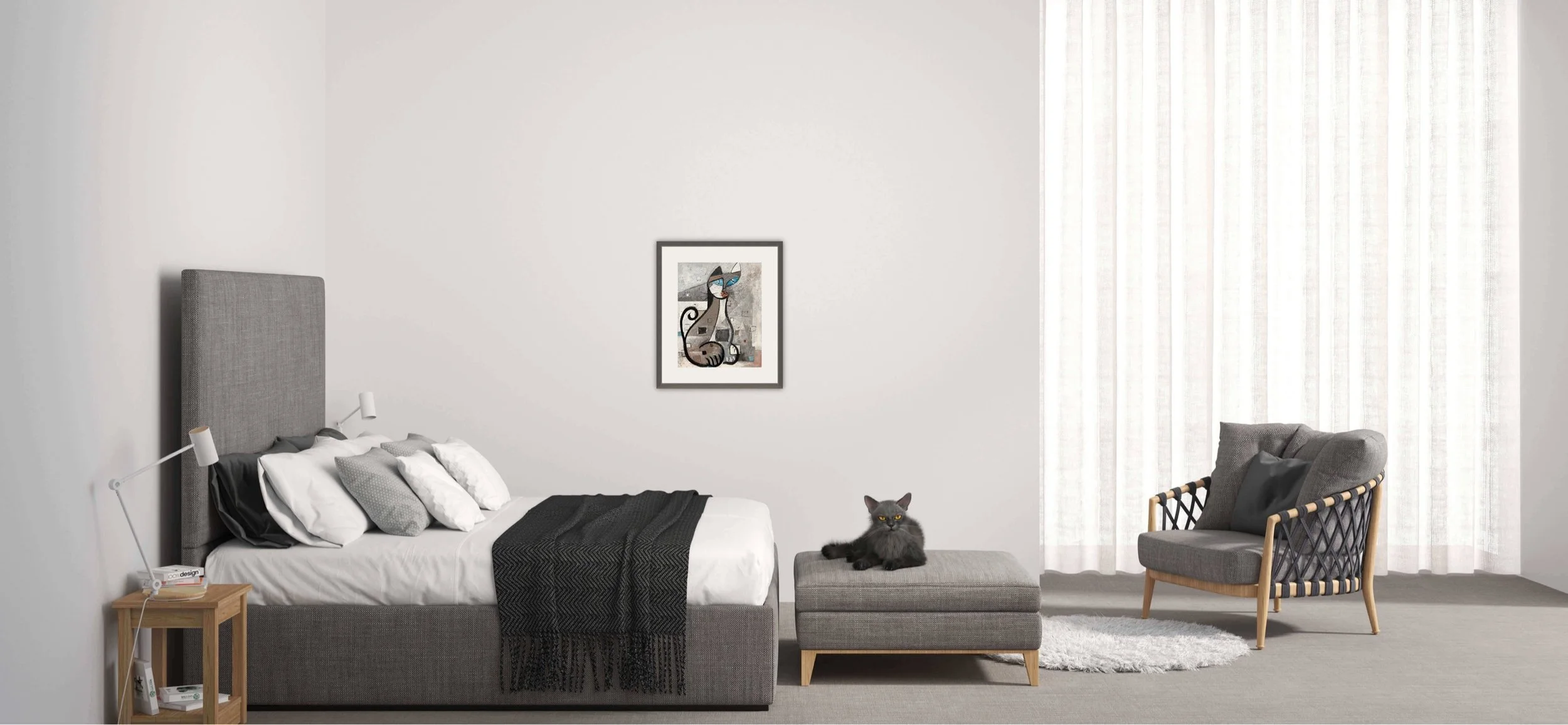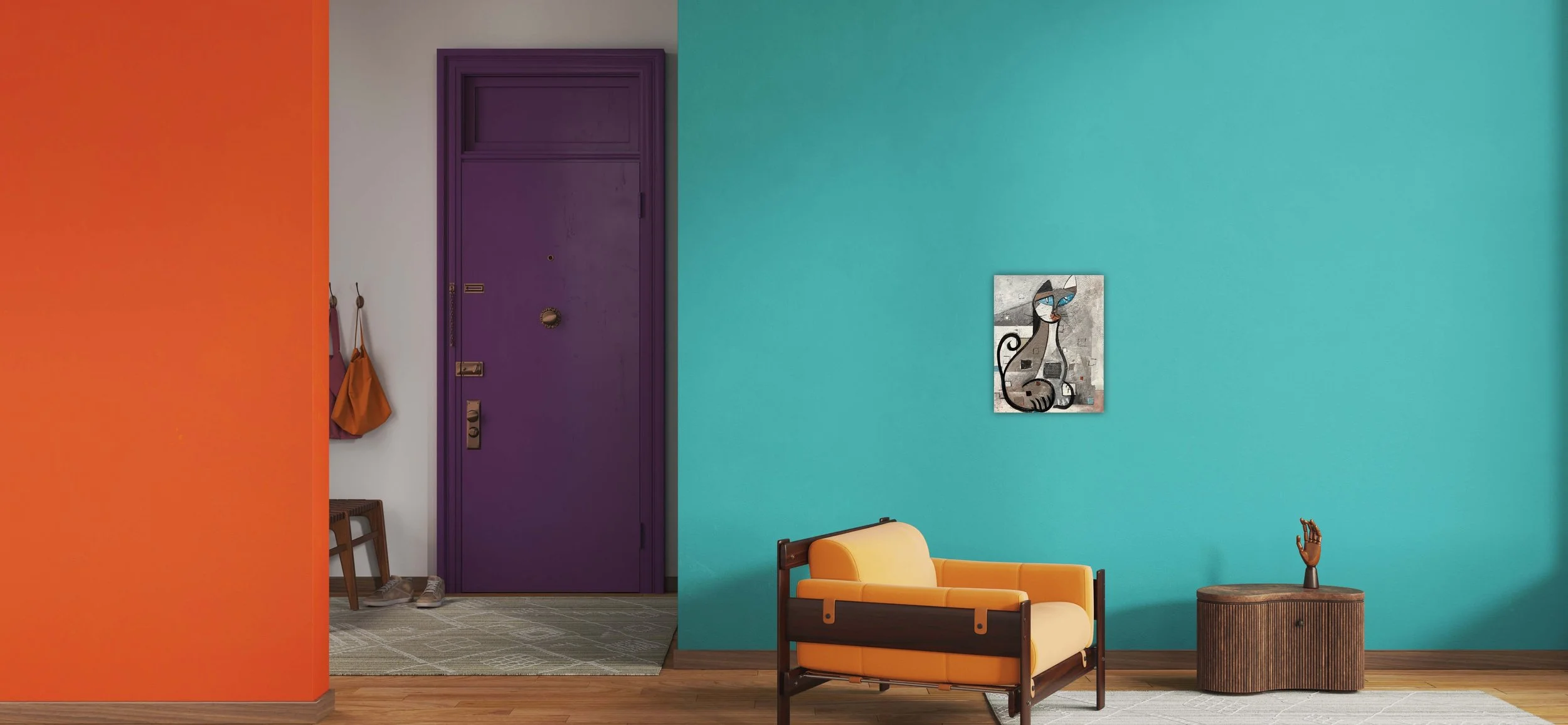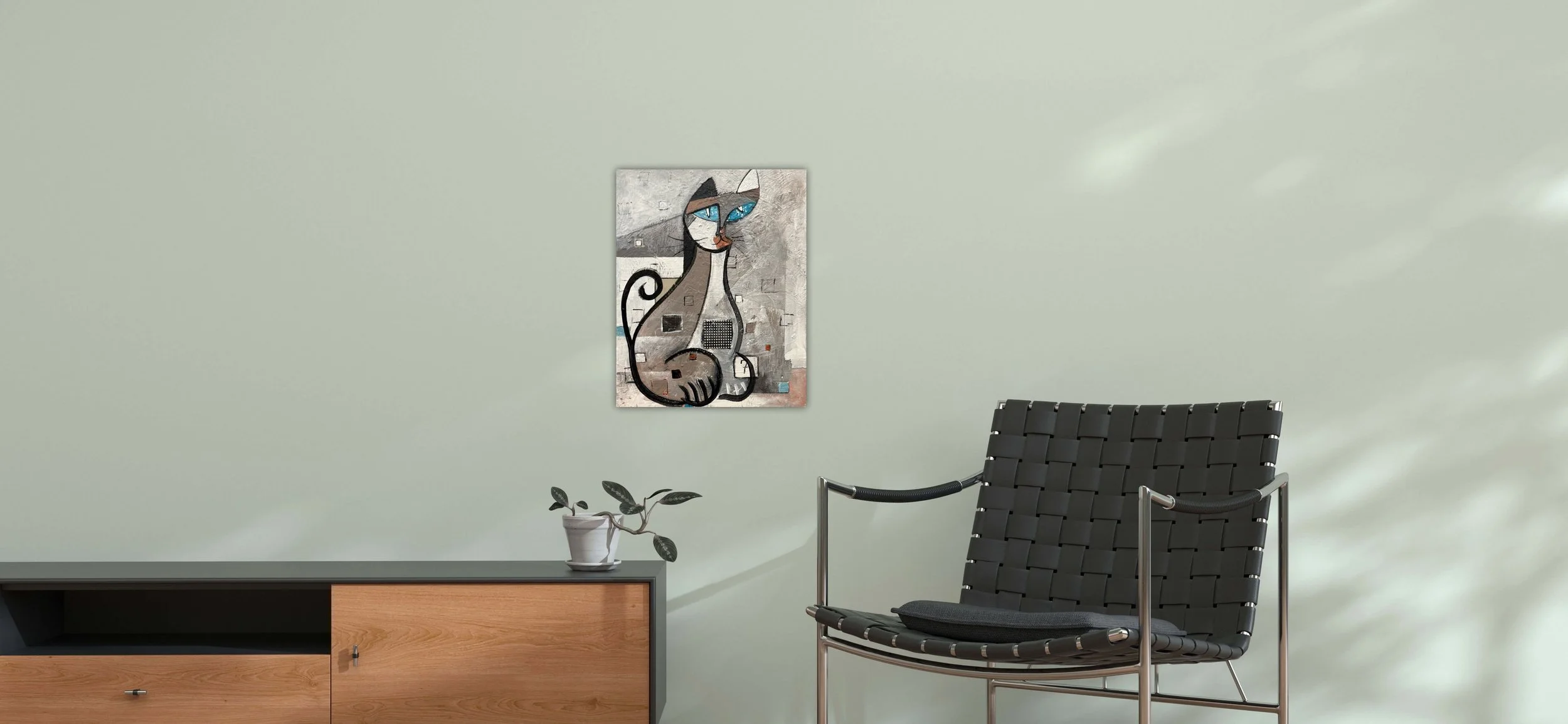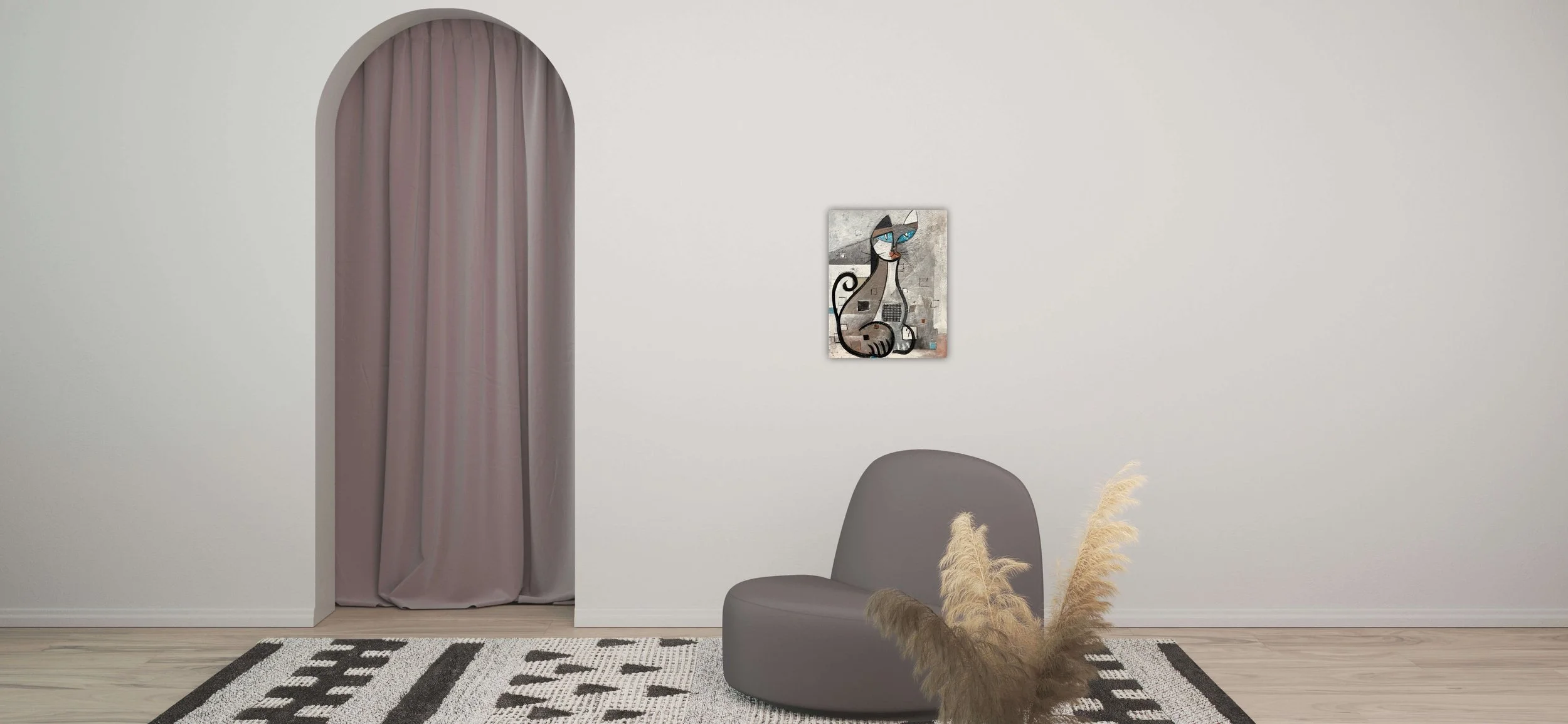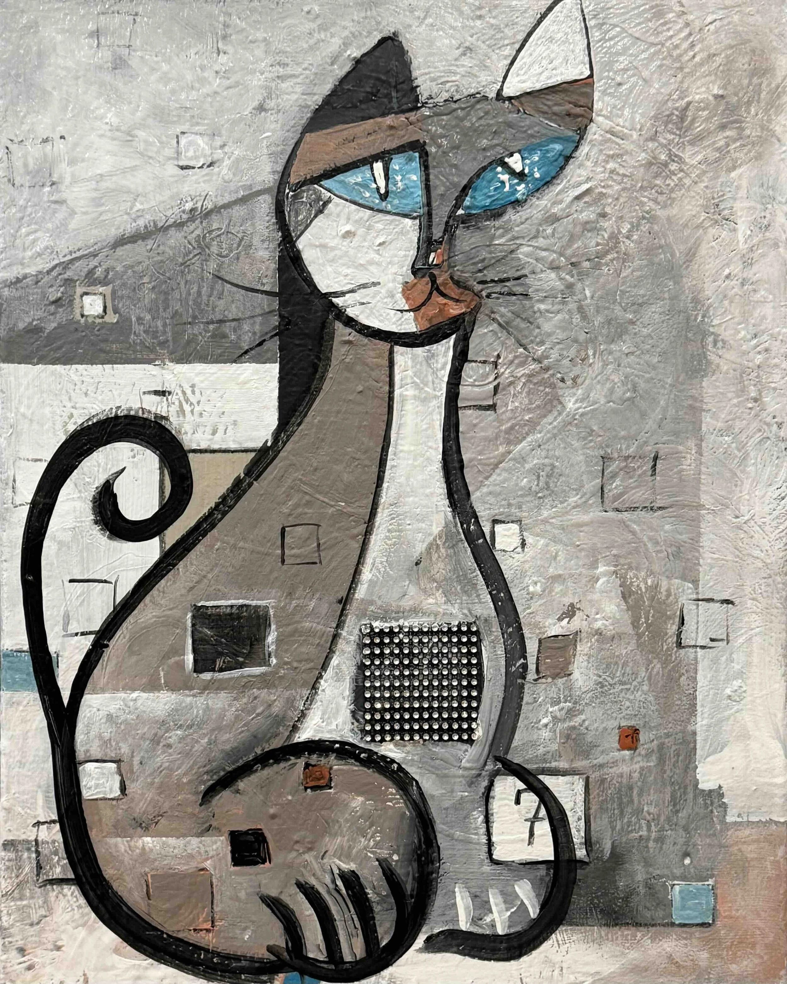 A cubist depiction of a cat. This painting is rich in texture and uses multiple layers of paint and materials to capture a level of innocence and mystique.