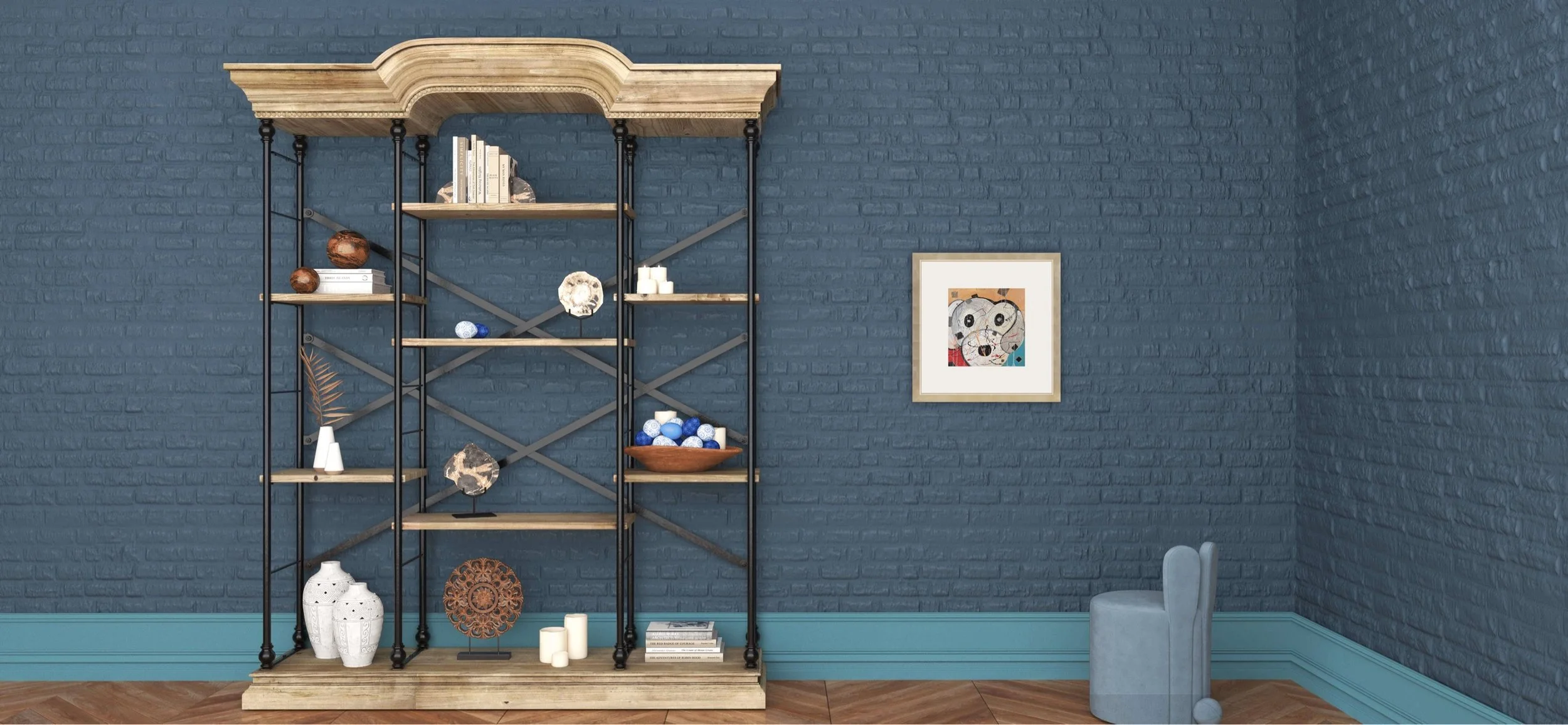 A happy puppy (that kinda looks like a cheeky little “minkey), sits in front of a vibrant backdrop. The painting evokes a smile and a sense of playfulness. It combines cubism with abstract expressionism (splits and splats) to accentuate the movement of a wagging tail and general playfulness.