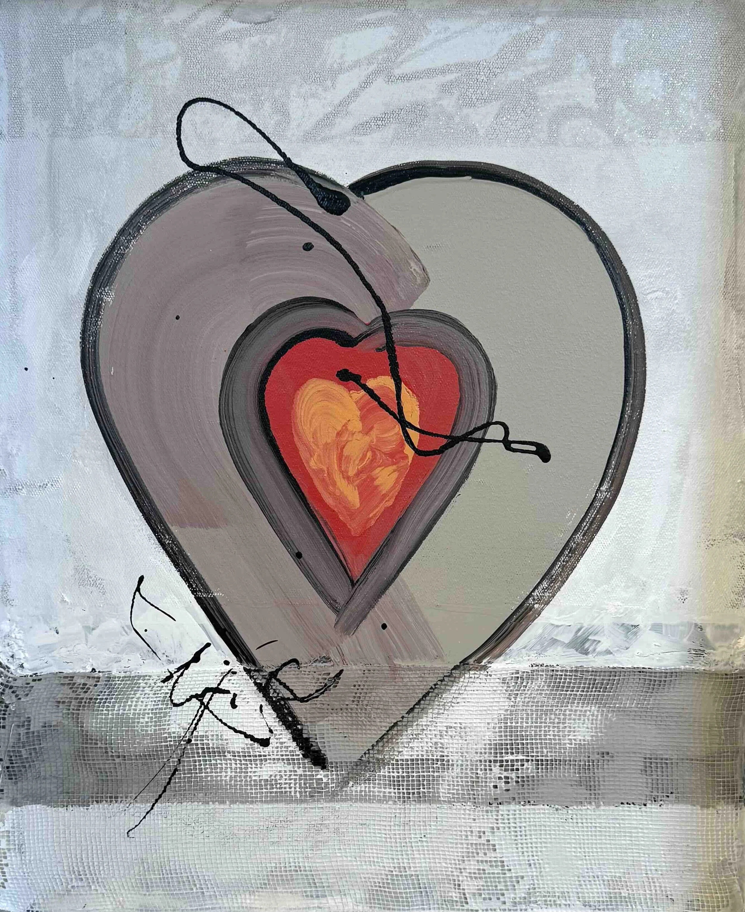 A solitary heart with a heart within is not about self-love, but rather love comes from within to then be shared. The palette is monochromatic with a bold yellow and red center to add drama, tension and contrast.