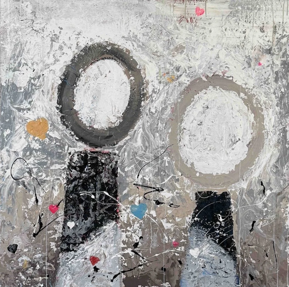 Two abstract and minimalist figures stand next to each other uniquely vibrant. In this painting, Vital incorporates fluorescent paint to accentuate the passionate energy exchange in healthy love.